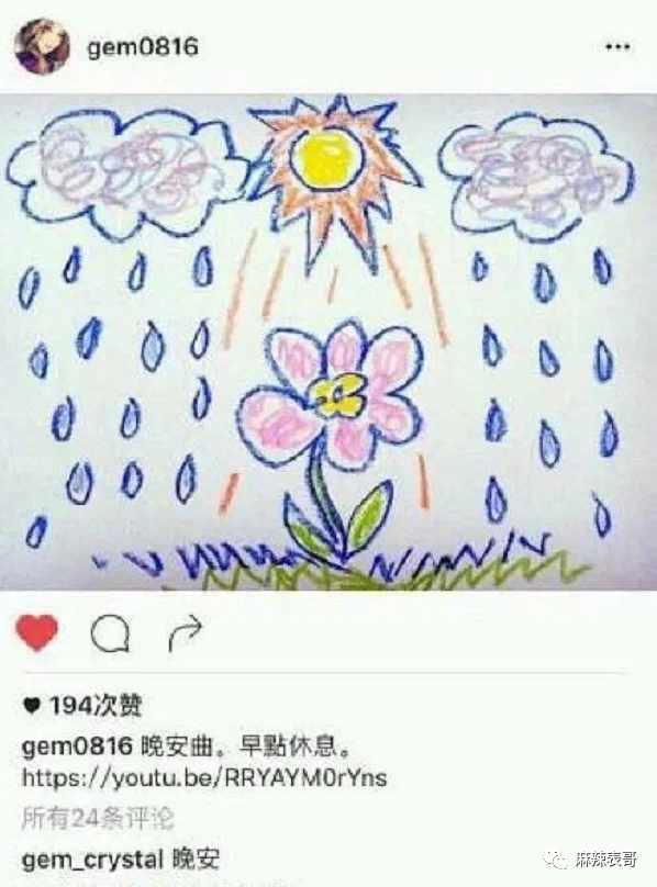 又巧了,邓紫棋在ins上发了一张花朵、晨雨的手绘画。