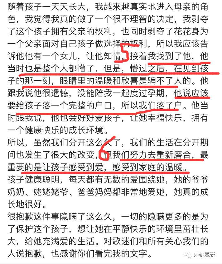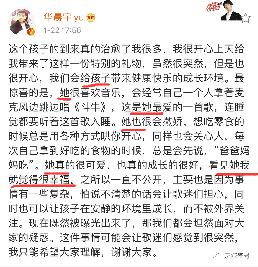 你们看看,是不是全篇都在替华晨宇说好话,立了一个当爸爸了全然不知,被告知当爹后立马扛起责任再度与孩子母亲磨合,还孩子一个幸福家庭的好男人形象?