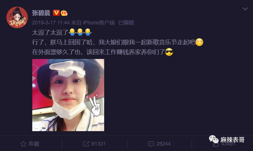 2019年3月17日,张碧晨发文“在外面漂够久了”,自称“大娘们”。文字不重要,我们着重看配图,戴的帽子。