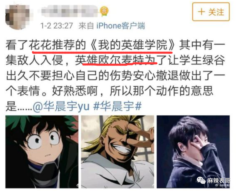 张碧晨看的漫画,是华晨宇推荐过的。“欧尔麦特”是里面是一个英雄。