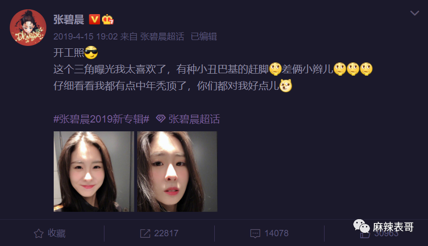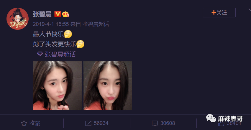 4月1日,张碧晨发了条博文,开始剪断了自己的头发,做了头发造型。