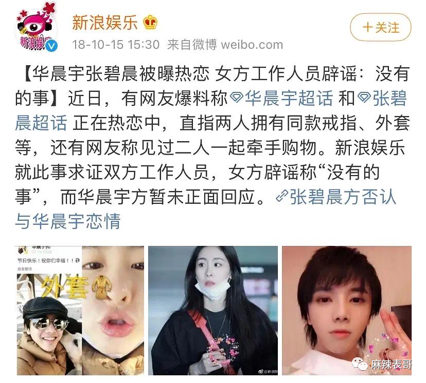 2018年10月15日,扒了很久的同款上了新闻,当时华晨宇依旧是不出声,张碧晨这边否认了恋情。