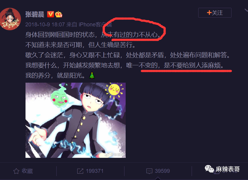 2018年10月,张碧晨发了条博文,说“身体状态力不从心”,说“唯一不变的,是不要给别人添麻烦”。