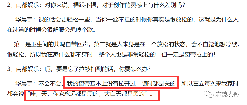 华晨宇对外说,自己几乎所有的创作,都是全裸创作的。虽然我在家里奔放,但我在外面腼腆。