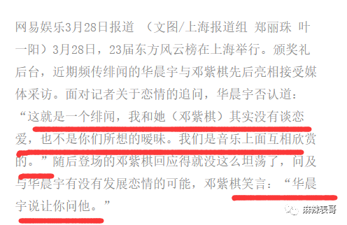 随后,华晨宇对外的说法是:我们就是音乐上的互相欣赏,没有暧昧也没有谈恋爱。
