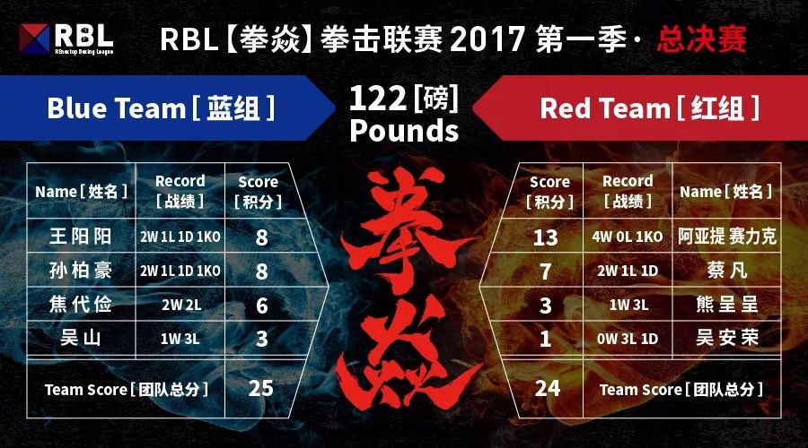 RBL“拳焱”拳击联赛4轮分组循环赛过后,122磅和140磅的红、蓝两组积分最高的四人:王阳阳(122磅)、阿亚提-赛力克(122磅)、努尔兰别克-阿依丁(140磅)、杨辉(140磅)将在12月24日RBL“拳焱”总决赛中,角逐年度个人冠军,奖金20万元人民币,即122磅和140磅将各产生一名年度个人冠军,奖金20万元人民币。