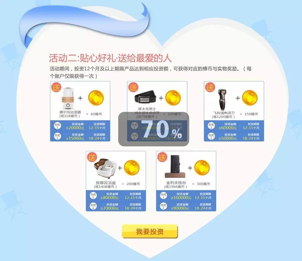 活动期间,投资12个月及以上期限产品达到相应投资额,可获得对应的蜂币与实物奖励。