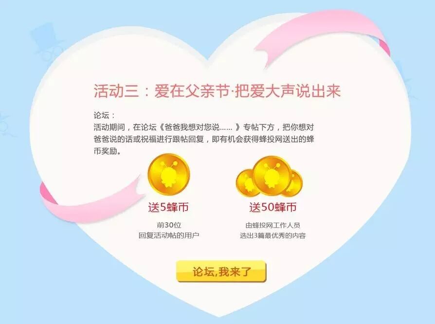 活动期间,在论坛《爸爸我想对你说...》专贴下方,把你想对爸爸说的话或祝福进行跟帖回复,即有机会获得蜂投网送出的蜂币奖励。