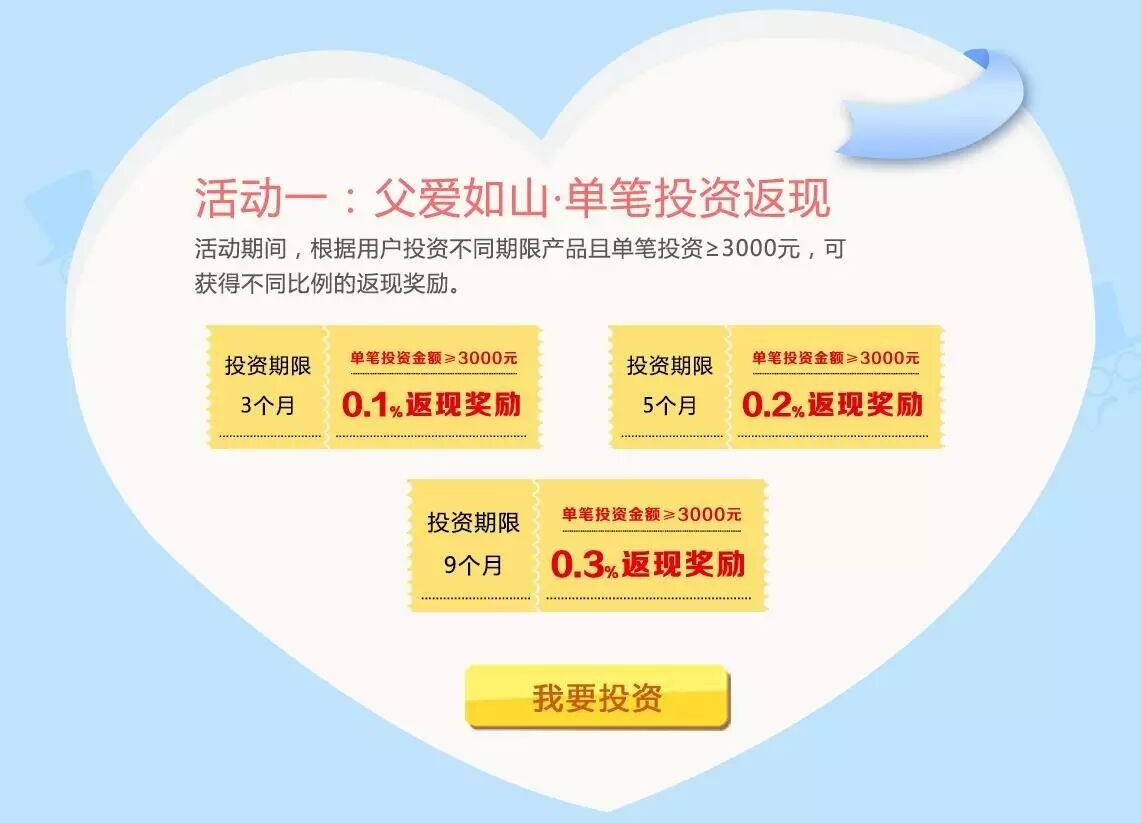 活动期间,根据用户投资不同期限产品且单笔投资大于等于3000元,可获得不同比例的返现奖励。