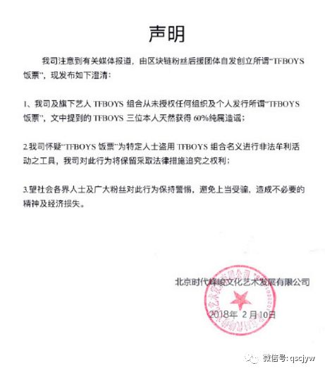 但是TFBC并不是由官方进行运营推出的,而是由粉丝后援团体自发制作的,TFBOYS经纪公司方面声明称从未授权任何组织及个人发行相关饭票,并怀疑是特定人士借用区块链概念盗用组合名义进行非法牟利活动。