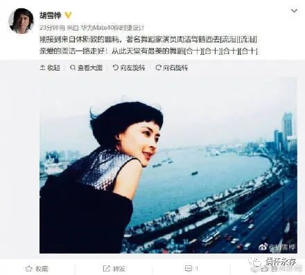 10月3日8时许,据导演@胡雪桦 称,“刚接到来自休斯敦的噩耗,著名舞蹈家演员周洁驾鹤西去。亲爱的周洁一路走好!从此天堂有最美的舞蹈。”周洁于1961年12月出生,是上海歌剧舞剧院国家一级舞蹈演员,中国当代舞蹈界代表。1992年周洁主演陈家林导演电影《杨贵妃》。1993年,该片获得第16届大众电影百花奖最佳故事片。(转自澎湃新闻 )