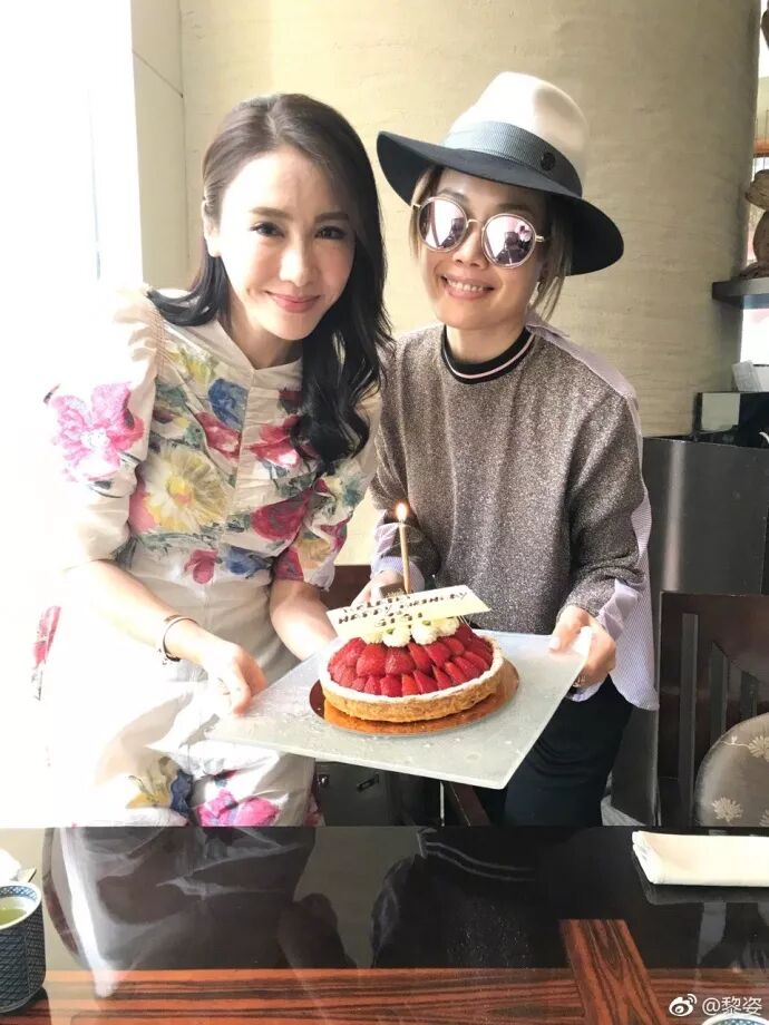 黎姿跟容祖儿合影,她的额头里还出现了不明青筋,不知是不是女神为了拼命对抗岁月而留下的产物。