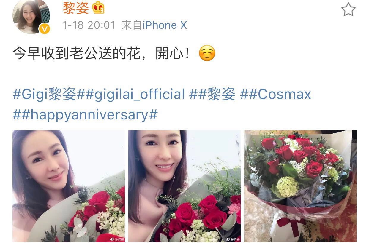 今晚,黎姿微博晒出一组照片,并配文:“今早收到老公送的花,开心。”