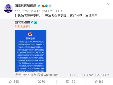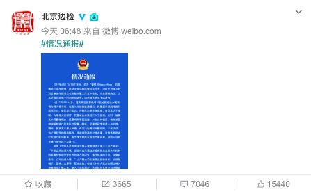 @北京边检发布通报几分钟后,@国家移民管理局转发该通报并配文:
