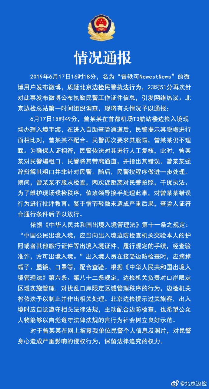 通报称,经调查,当天下午,曾某某在首都机场T3航站楼办理入境手续时,不配合脱帽进行面相对比,民警依法对其进行人工复核却遭其爆粗口,遂将其带离通道。