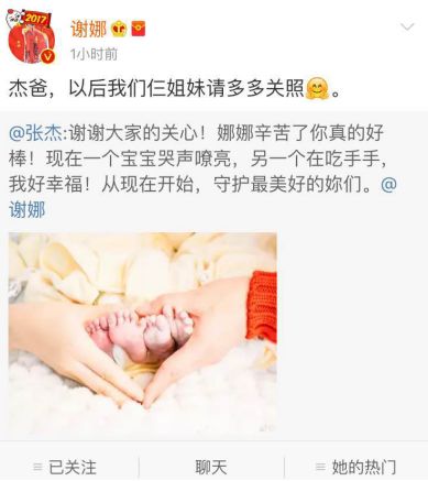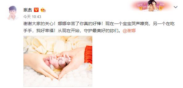 2月1日,张杰发文宣布谢娜生下双胞胎女儿,二人正式升级成为爸妈。张杰甜蜜表白谢娜“娜娜辛苦了你真的好棒!”同时公布两个女儿情况:“现在一个宝宝哭声嘹亮,另一个在吃手手,我好幸福!”