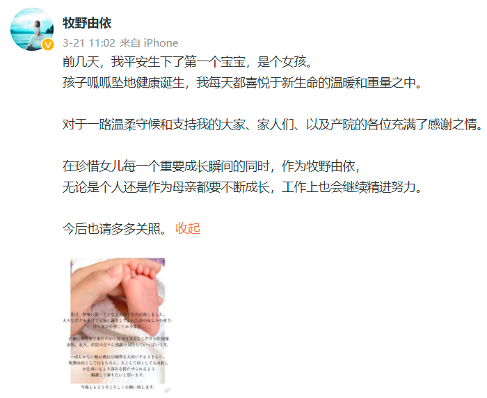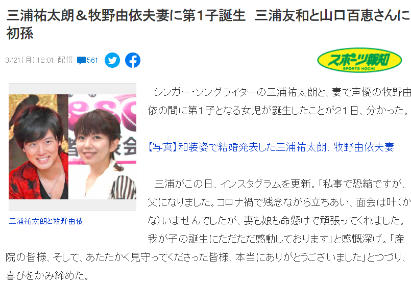 3月21日,山口百惠和三浦友和的大儿子演员三浦祐太朗在社交平台上宣布自己和声优妻子牧野由依的第一个小孩平安诞生。