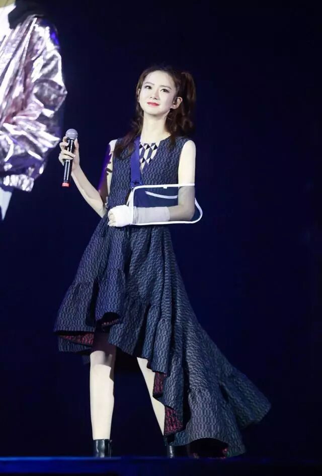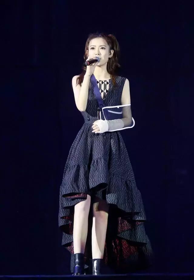戚薇的发型也十分洋气,梳着两个马尾辫子,活泼可爱,与裙子更配哦。台上唱歌,十分具有明星气质,不会因为胳膊受伤而影响发挥。