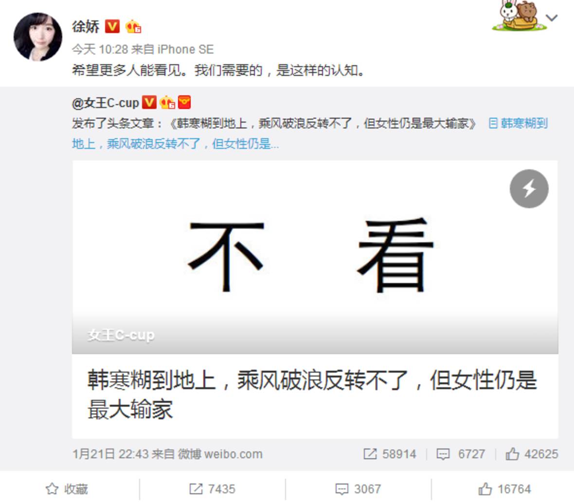 半年前,曾因为那首冒犯女性的《乘风破浪歌》而怒怼韩寒,维护身为女性的权益。