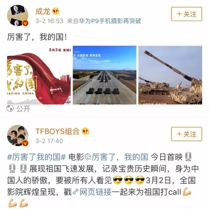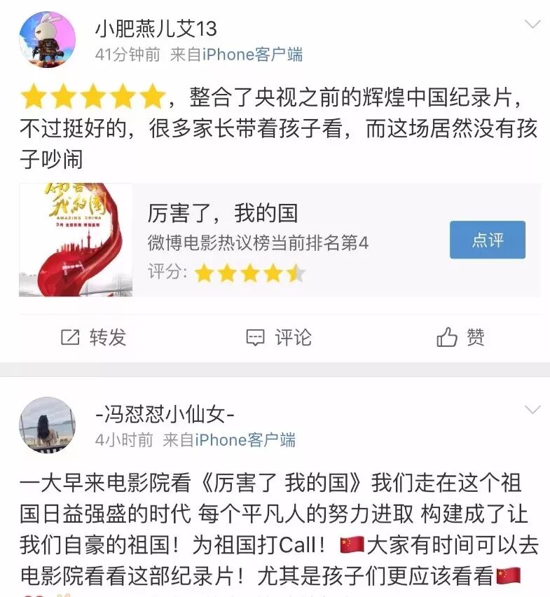 微博和朋友圈也是持续刷屏,好评如潮。各路明星大咖都为《厉害了,我的国》代言。