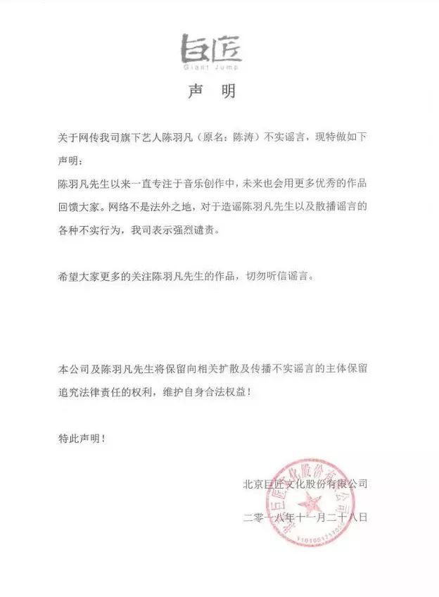 上午十点左右,由胡海泉,陈羽凡两人创立的公司巨匠文化发文辟谣,说这些都是“不实谣言”,不仅“保留追究法律责任的权利”,还叭叭盖个章,说得理直气壮。