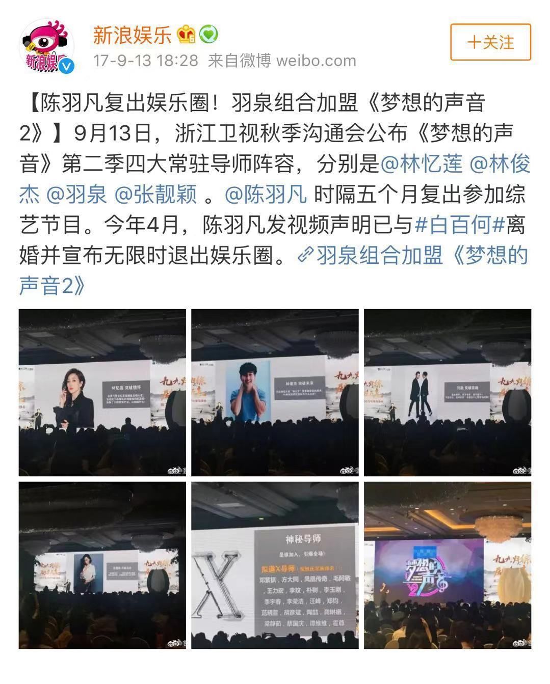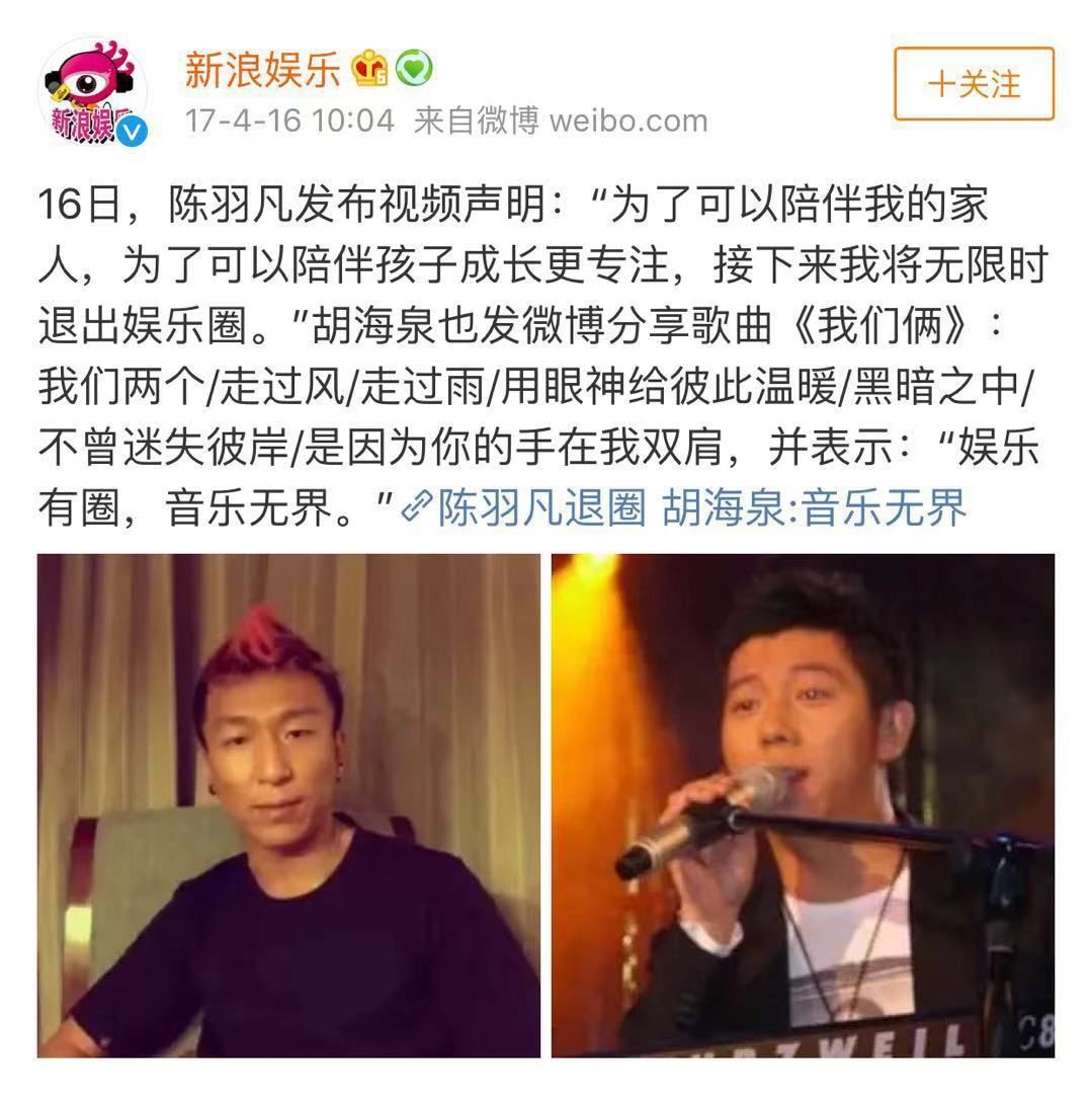 结果陈羽凡四月退出娱乐圈,九月就宣布复出,号称“最短时间复出明星”,羽泉以组合的形式参加娱乐节目《梦想的声音2》。