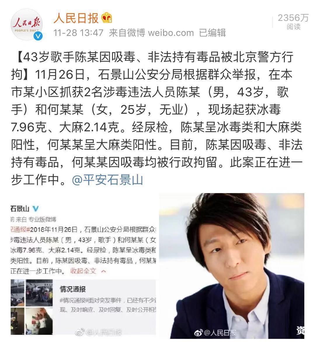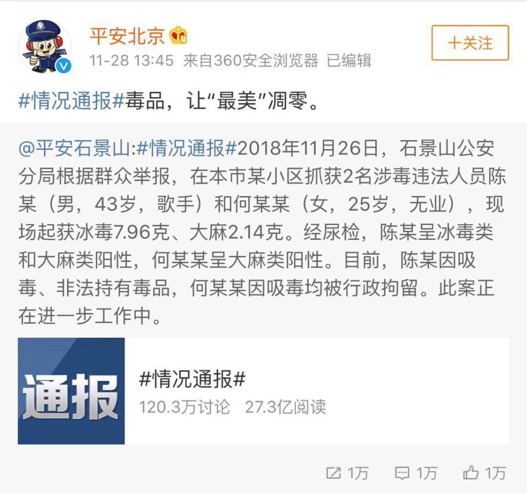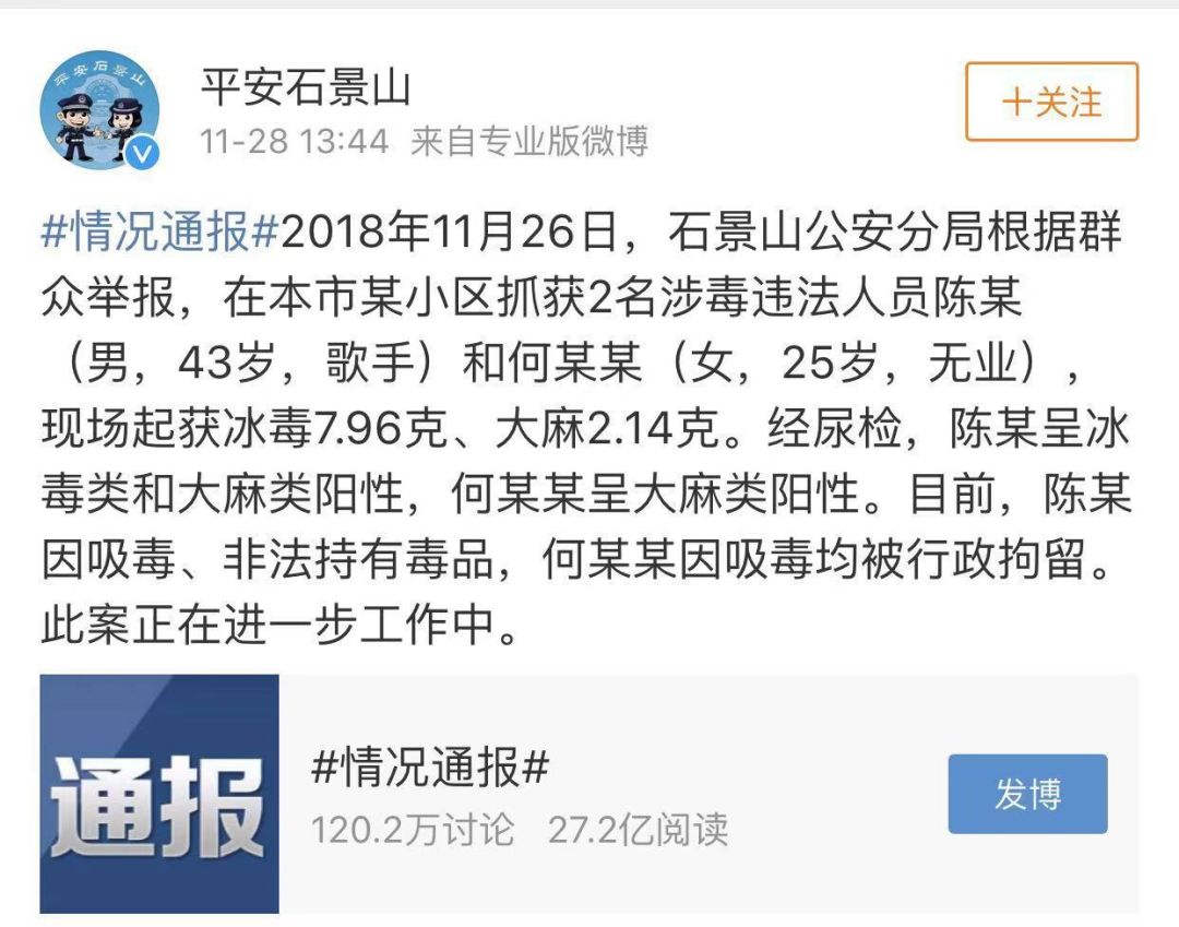 结果还没过两小时,陈羽凡和他的公司就迎来了有史以来最快速的打脸,平安石景山发布通告,43岁的陈姓歌手吸毒被捕。