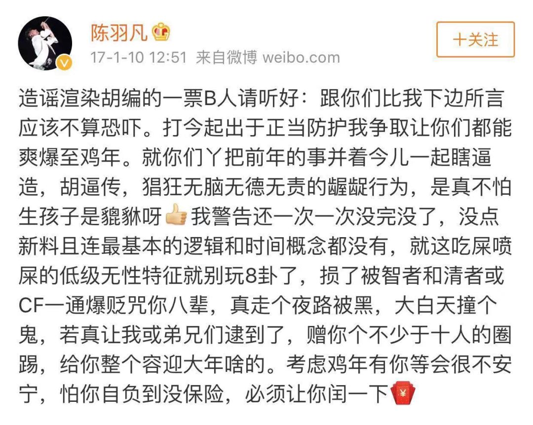陈羽凡也是从来都不承认离婚,去年1月,距离两人离婚超过一年,他还在微博辟谣,大骂诅咒他离婚的人。
