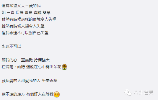 单身是一种自主选择,不是罪,还可以很快乐。正如陈乔恩在生日愿望里写的:“虽然环境让人失望,但不可以对自己失望...愿我的心一直持续强大”! 同时也对爱情抱有期待:“愿不远的远方,有个好人在等我”。就这样,做着喜欢的事情,过着充实的生活,全身心关注自己的成长,又对未来有所期待,三姑六婆怎懂这种幸福?即使此刻的我不那么快乐,也不是被逼结婚的理由。爱咋咋滴,让剩女这个词见鬼去吧!
