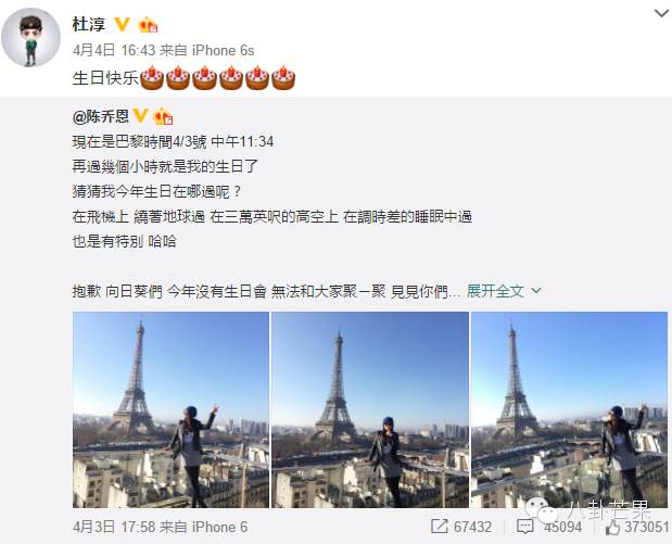 前几天陈乔恩生日,杜淳转发祝福: