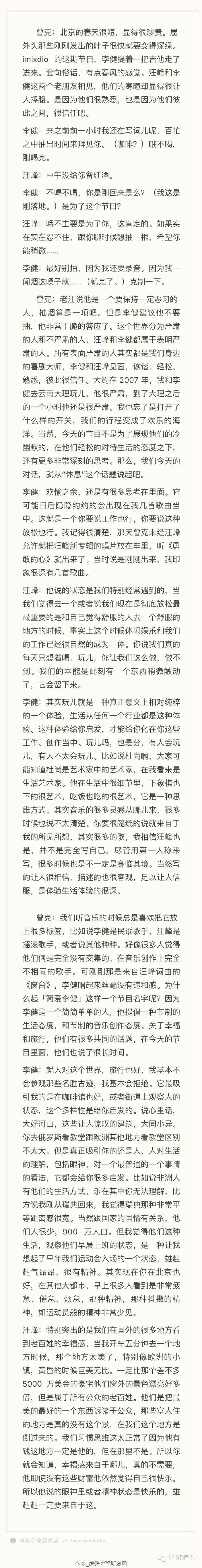 【转】汪峰电台-简爱李健(上) 听健看健 内地男星 2016-04-04 19:24:36 1111 创作不易,用心坚持,欢迎请BaGua喝几杯爱心咖啡!打赏并支持本文 打赏并删除本文 点击上方“听健看健”关注我们 透明歌声穿云而响之时每个音符都能被触摸连想象都会变得和笑靥一样真听李健唱歌如沐春风文字版内容整理 微博:李_健最体面听友团听健看健ID:lijiantingyou2015在这里,我们一起听健看健,一起享受健哥美好的音乐。谢谢你,亲爱的听友们。 创作不易,用心坚持,欢迎请BaGua喝几杯爱心咖啡!打赏并支持本文 打赏并删除本文 感谢您的支持鼓励,我会继续努力的!文章地址:用户邮箱:打赏金额:USDT 请输入数字点击”去打赏“,即可进行打赏支持本文章哦 李健 About the Author 听健看健 功能介绍:李健和他的听友 Related Posts 【李健和他的演奏家们】笛箫——陈悦 2017-10-31 17:51:18 【李健·云栖·虾米音乐节攻略】 2017-10-10 19:01:54 【李健和他的演奏家们】聆听巴扬手风琴的悠扬 2017-09-12 20:02:16 【听友来稿】李健改编曲目之《枫桥夜泊》赏析(下) by ... 2016-09-01 21:03:08 【拾光】李健和他的《似水流年》,回归本真,纯净自然 2016-08-28 11:15:38 发表评论