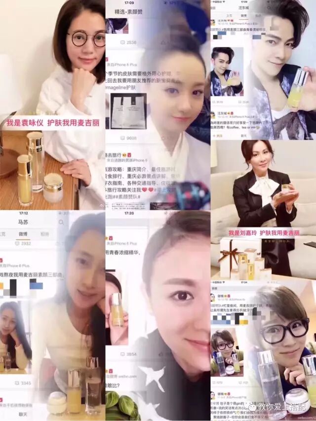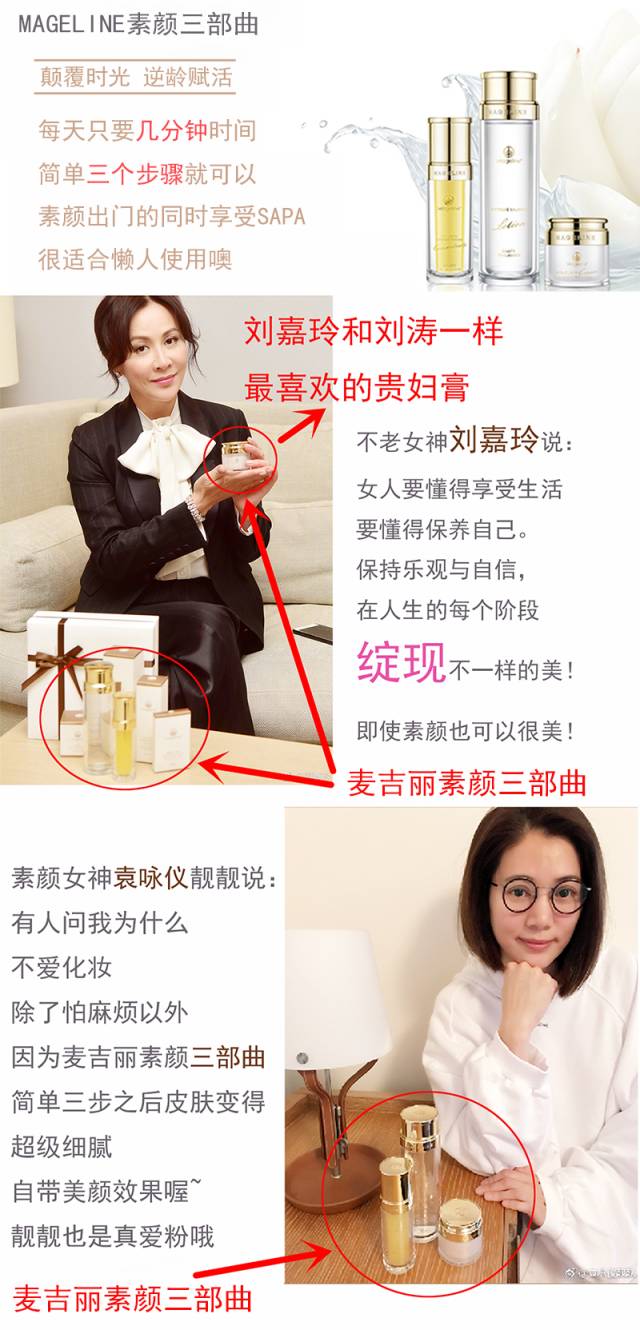 还有马苏,马苏更是麦吉丽三部曲(贵妇膏是三部曲其中一款产品)的忠实粉丝,从原来的微博推荐到现在马苏已经成为了麦吉丽的品牌代言人。
