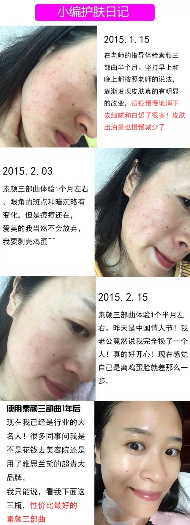 小编我是一名从业多年的美容顾问,专门撰写一些关于美丽女人的文章。而我自己因为整天对着电脑,却是一个满脸斑点痘痘痘印的女人。既然要下定决心推荐这款素颜三部曲,我自己当然也要用。