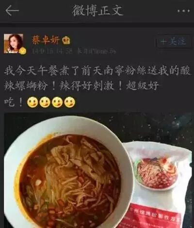 看微博上的甜蜜话语,这碗螺蛳粉八成就是范冰冰给她煮的哟!因为,冰冰2014年在柳州参加活动时,说过自己是螺蛳粉的粉丝哟!