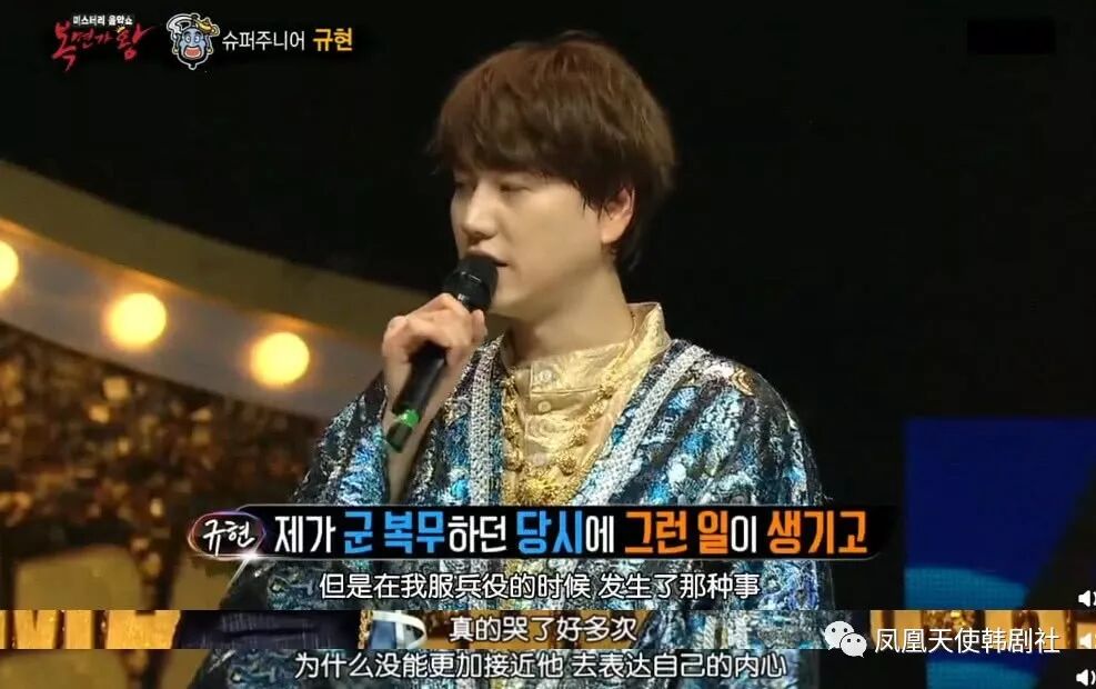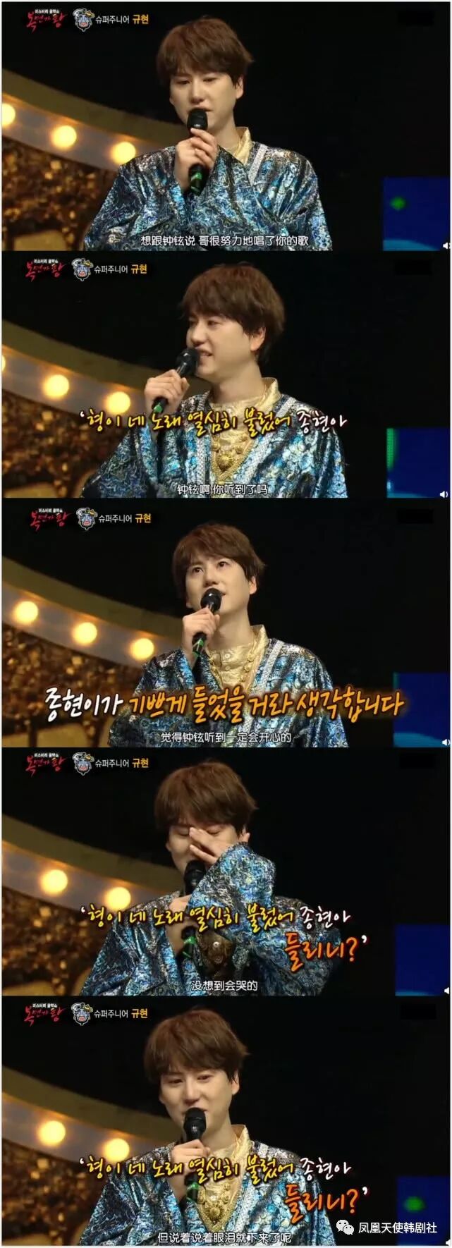 而圭贤翻唱这首歌,也是为了寄托对金钟铉的思念之情。圭贤练习还没有出道的时候,练习时间并不是很长,钟铉那时候也很照顾他。所以对于圭贤来说,金钟铉是很珍贵的朋友,在出道之后关系也很好。但那是在自己服兵役的时候, 传来了金钟铉自杀的消息,对于圭贤来说是晴天霹雳。他哭了很多次,同时也非常后悔。他后悔自己明明是哥哥却没有注意到钟铉的异样,也没有更多去了解他的内心。在舞台上唱这首歌,是为了怀念钟铉,也是为了唱给钟铉听。圭贤说到这些的时候,眼泪更是忍不住掉下来,停顿了一会才说完他想说的话。钟铉虽然离开我们了,但是他的歌曲,他存在过的痕迹,是不可能消失的。也许我们要感谢圭贤,感谢他用这样方式提醒我们,钟铉来过这个世界。相信他一定能够听到的,对吗?——— THE END —————本文系微信公众号“凤凰天使韩剧社”原创稿件,禁止转载,违者必追究其法律责任。