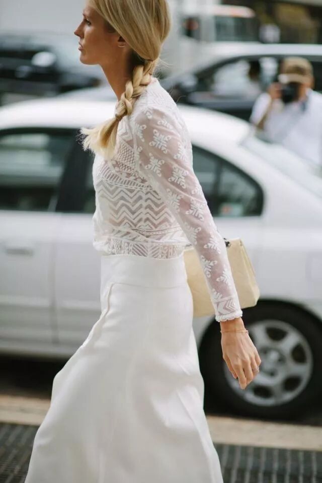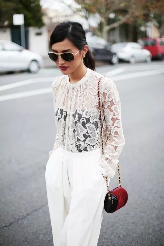 白色的蕾丝上衣都是满满的小心机,配同色系的下装清爽动人。这时搭配黑色的包包可以营造视觉冲击的美感,白色的包包又可以更加仙气十足。
