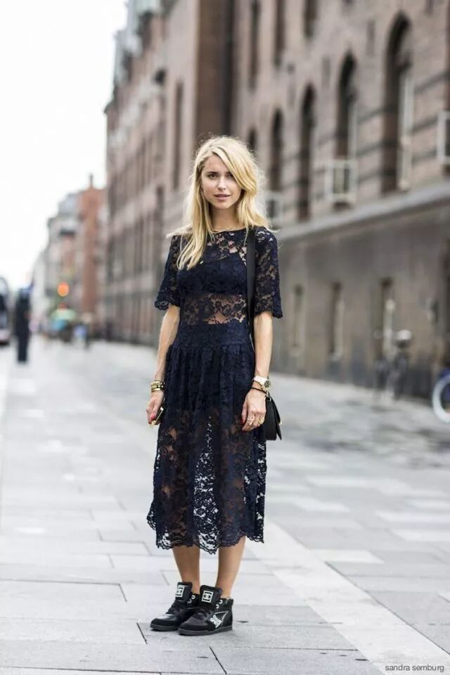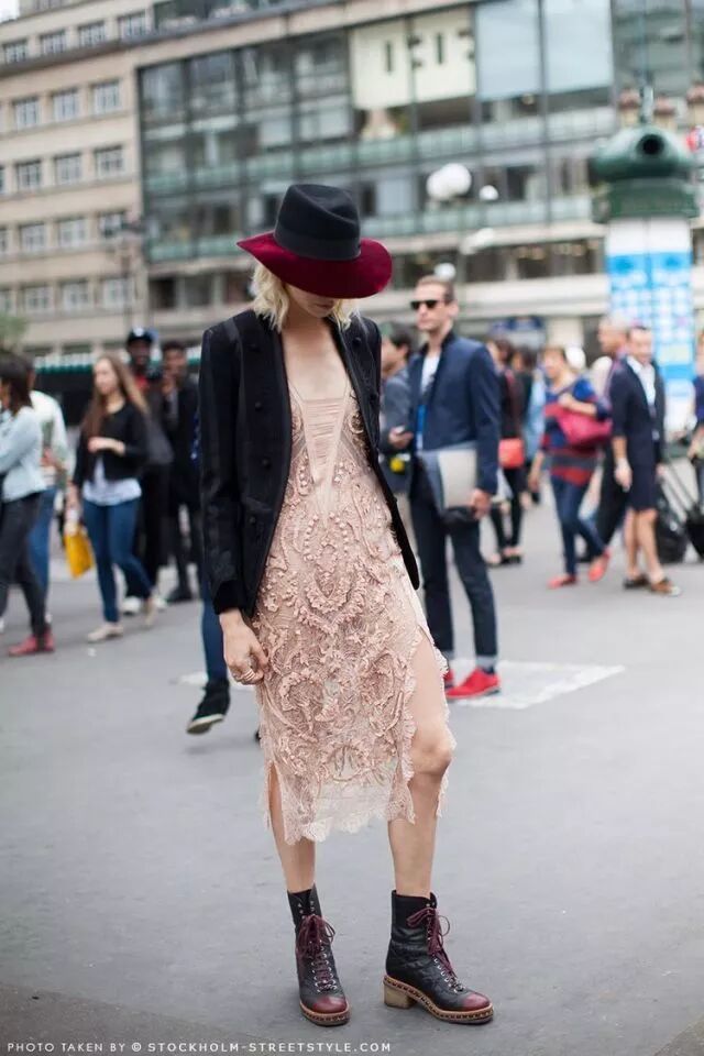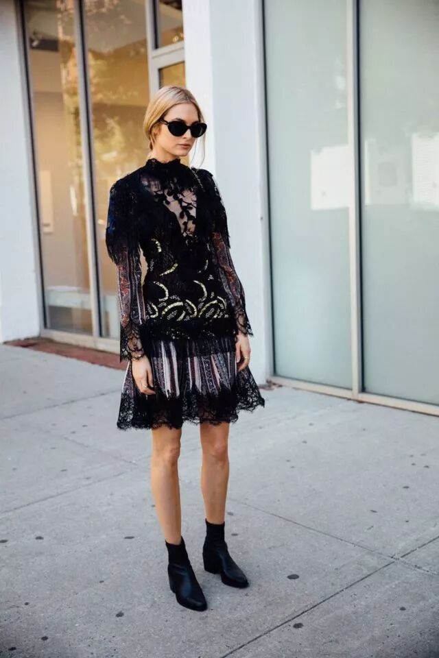 黑色的蕾丝裙又性感又神秘,粉色或者白色的又尽显女人的妩媚可爱,如果想要帅气一点就可以随意加一件硬朗属性的单品,黑色包包和短靴就是不错的选择。