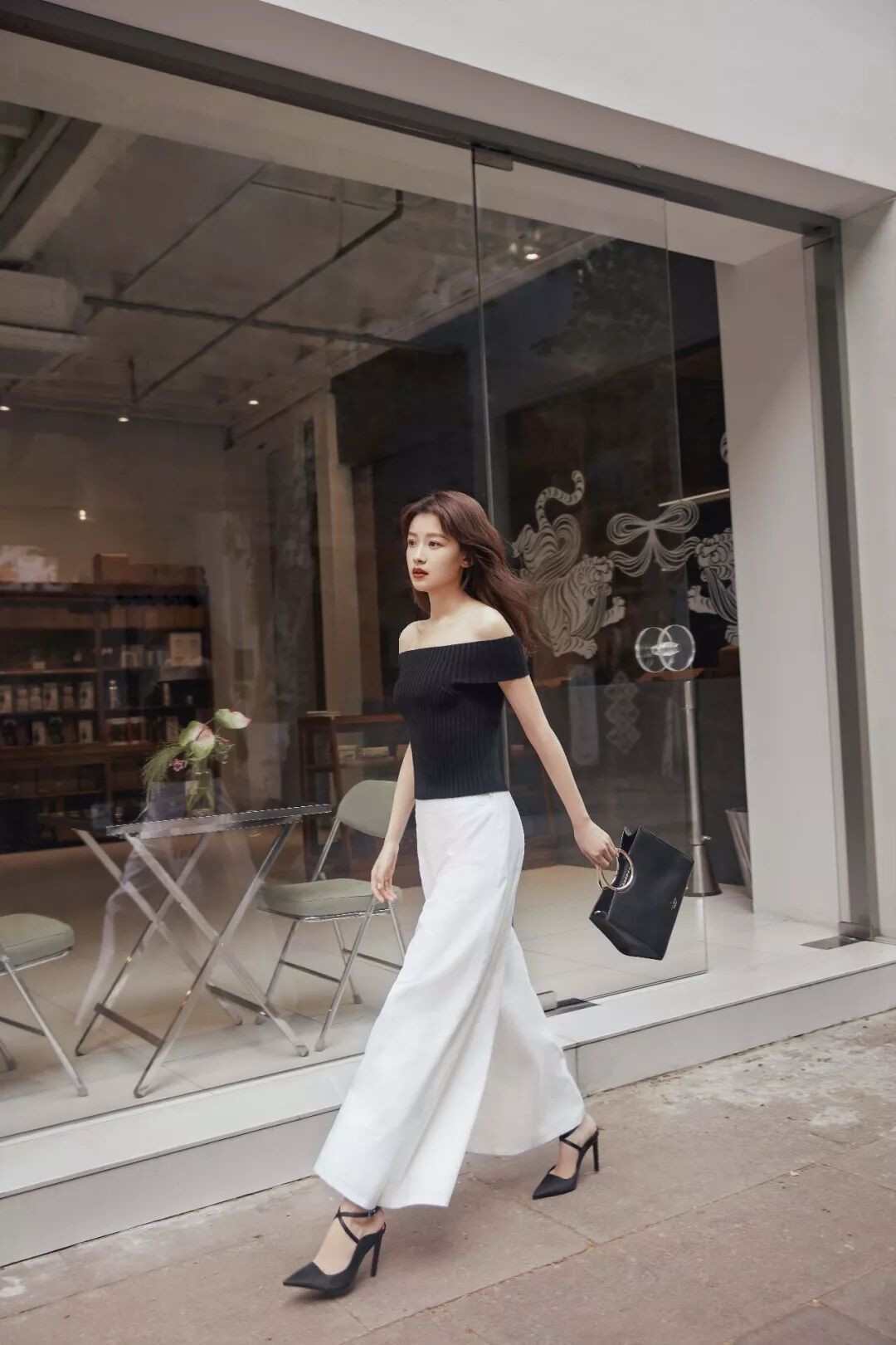 黑色一字肩搭配白色阔腿裤,永远不会出错的黑白搭配,在夏日清爽不失细腻,一字肩的设计细节更是拥有教科书级别的高级性感。