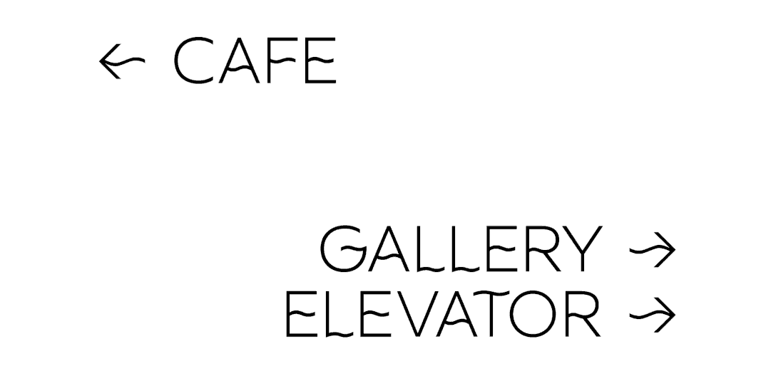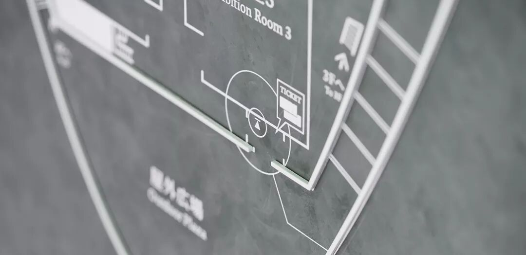 サイン計画は、五線譜のような格子の上に文字や矢印を配し、空間に情報を浮遊させています。