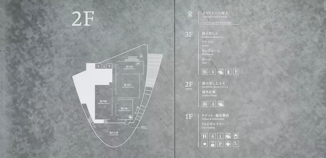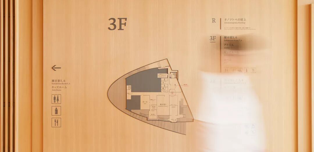 シンボルマークは建築の造形を抽象化したもので、建築内部では各施設の場所を示す機能を果たしています。