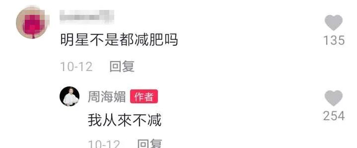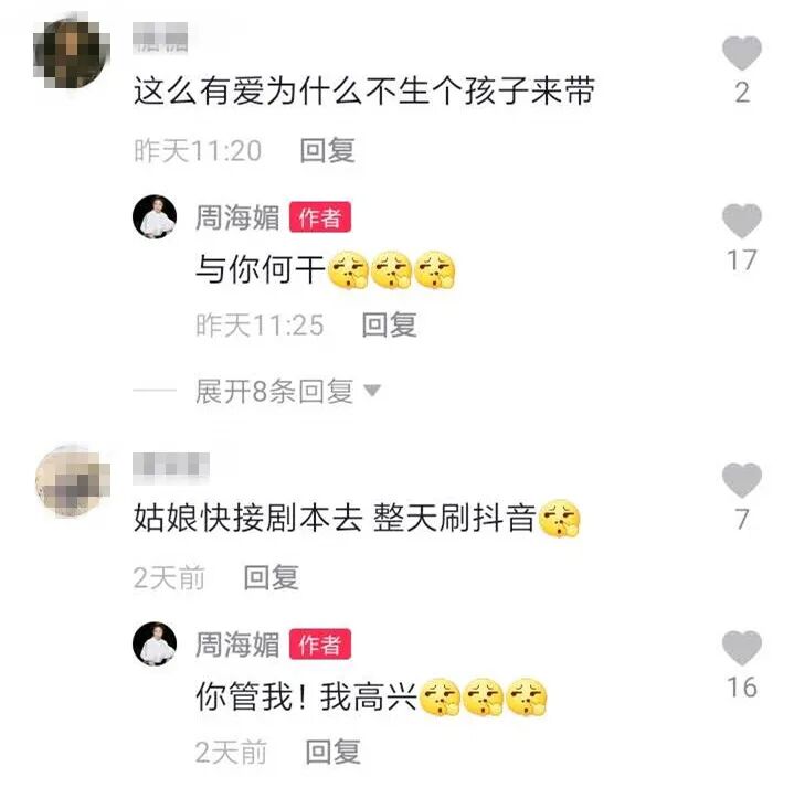 之后,又有网友叫周海媚不要顾着拍视频,多接戏,她又回复,你管我,我高兴。翻看周海媚之前发的视频,发现她说话真的很我行我素。之前她发布吃火锅的视频,有网友问她,明星不是要减肥吗?她直接回复,我从来不减。