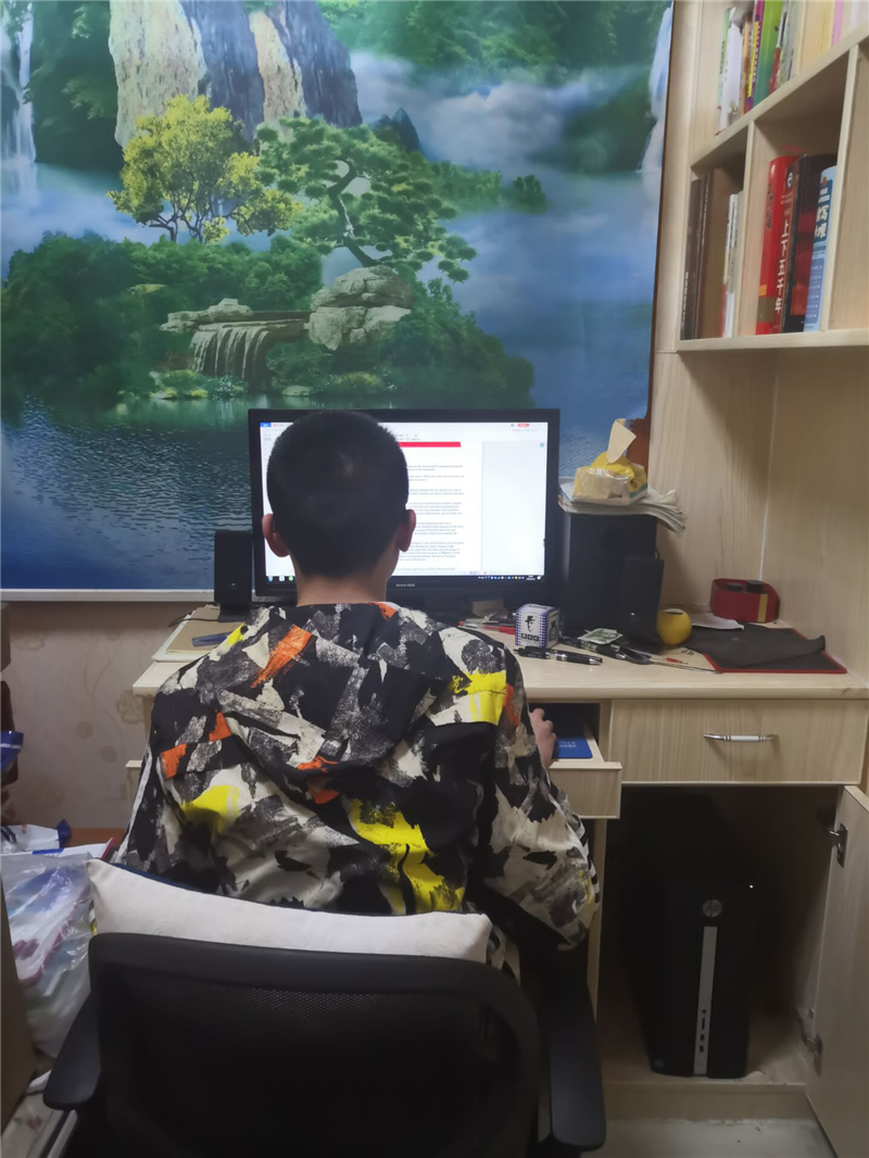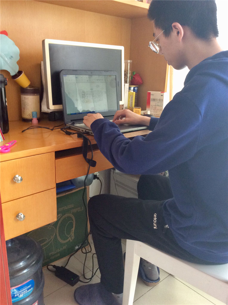 在IMMC2020中华赛期间,杨志豪(左一)、邓安奇(左二)、刘鹏(右一)三位同学正在解题
