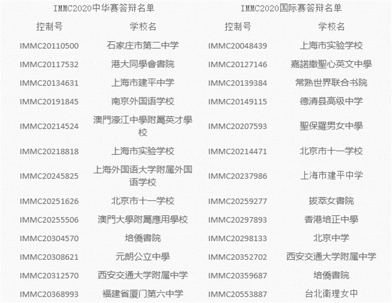 根据第六届国际数学建模挑战赛 IMMC2020 中华赛区的论文评审结果,遵循委员会命题论文评选或团队自选题论文评选类别,来自大陆、台湾、香港和澳门的650余支参赛团队中共25支队伍入选中华赛答辩决赛;同时,晋级国际赛的184支团队中,共有25支队伍入选国际赛答辩决赛。