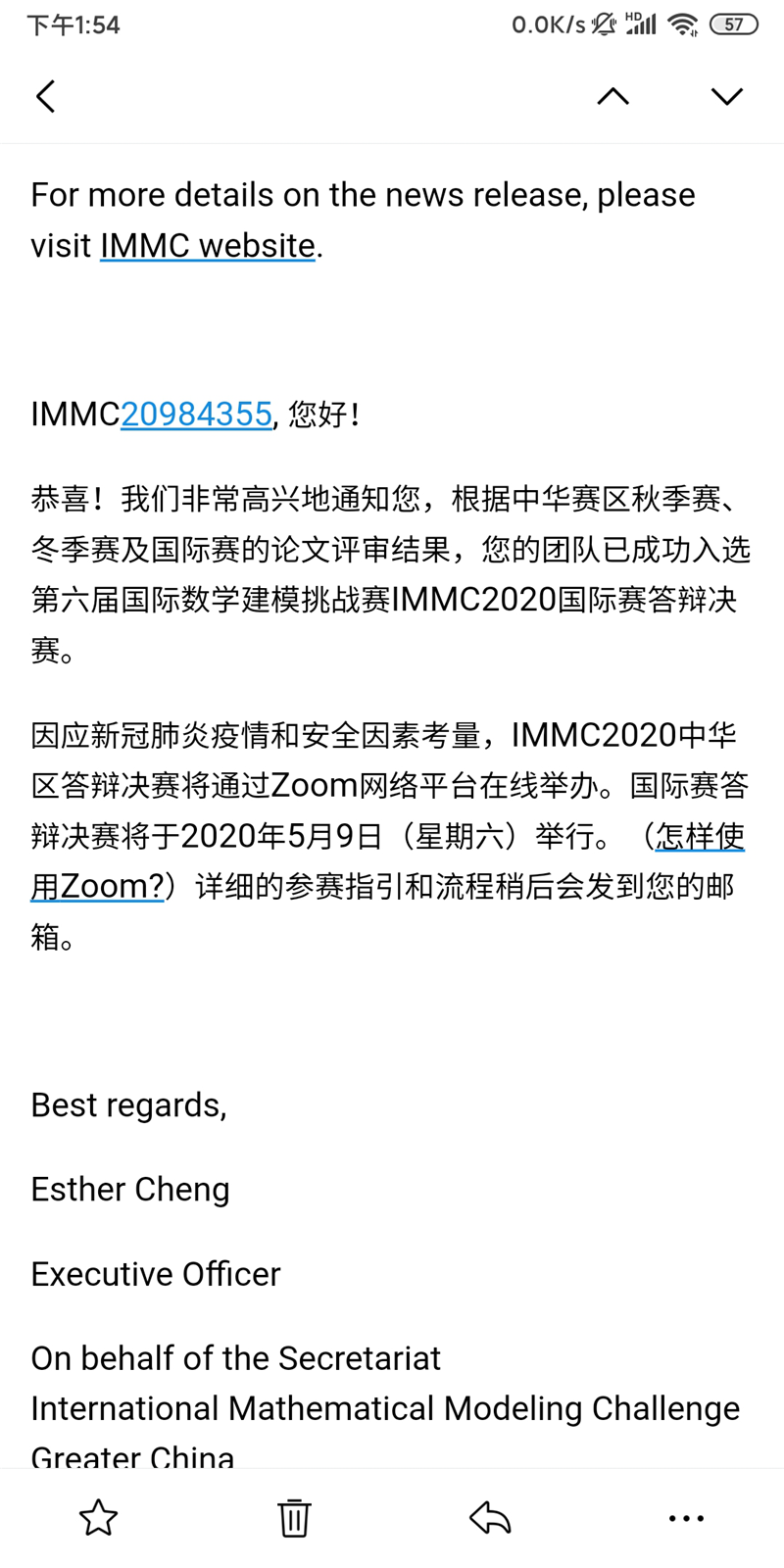 受新冠肺炎疫情风险的影响,IMMC2020中华区答辩决赛将采取远程在线形式。中华赛及国际赛答辩决赛将分别于2020年5月8(星期五)和9日(星期六)举行。答辩详细安排将以电邮通知参加者。
