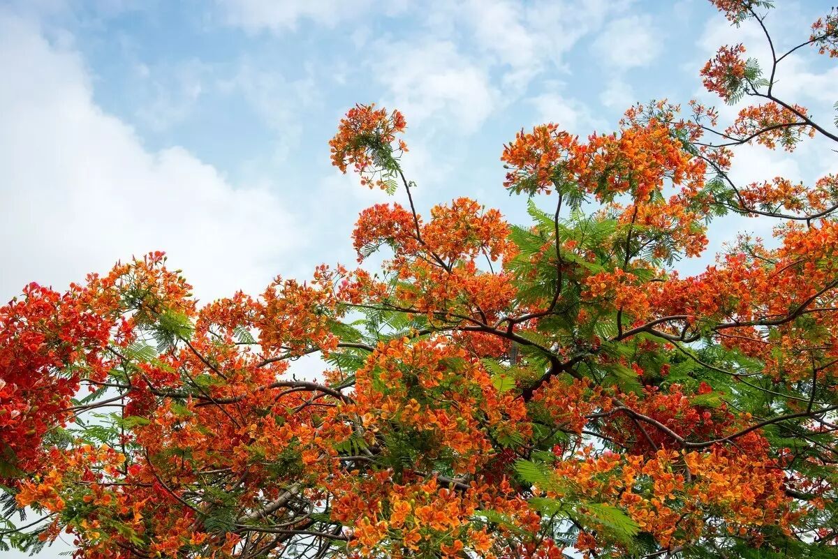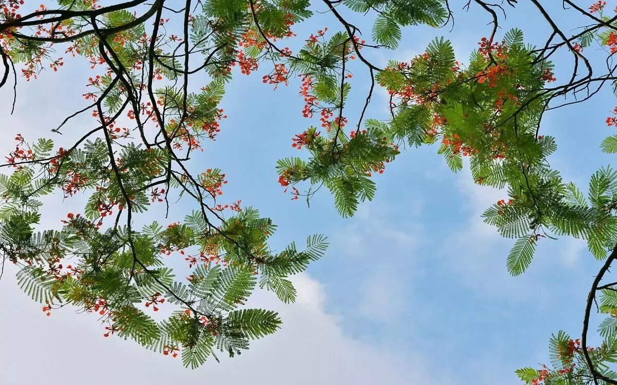 火红的凤凰花果然跟热情的夏天更配,一团团红彤彤的花摇曳在枝头好热闹,看得人心花怒放。站在花树下,随手一拍都是满屏醉人的红!