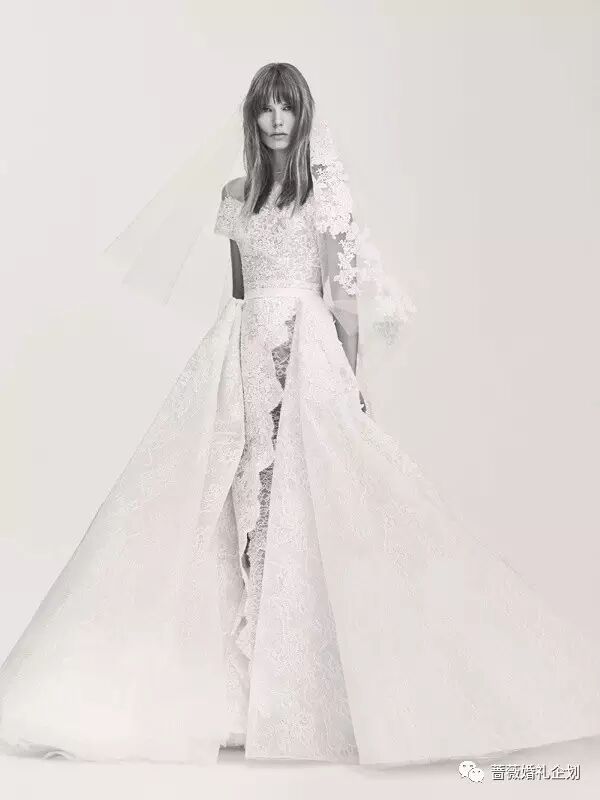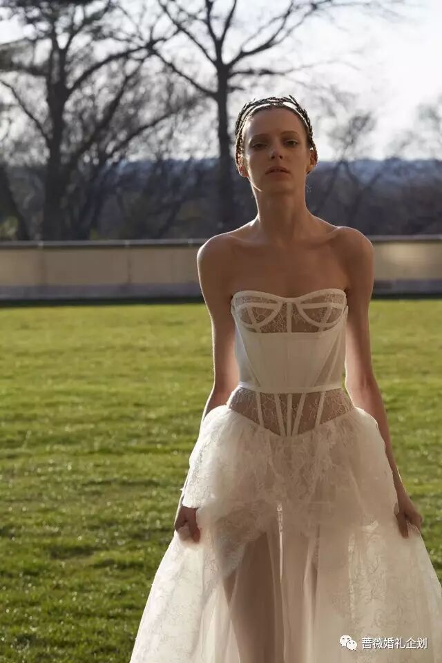 Vera Wang的2017春夏系列继续颠覆传统,以 Désir à l'Anglaise 英伦诱惑为主题,用雪纺高领,露肤鱼骨,绑带罗马鞋打造出充满宫廷气息的骑士新娘形象。