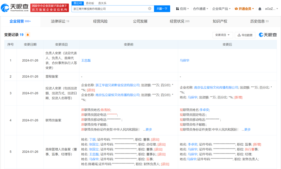 记者从天眼查App获悉,浙江常升影视制作有限公司发生工商变更,王忠磊卸任法定代表人、董事长,张国立卸任董事、总经理,原监事马保华改任法定代表人、执行董事、经理,并成为股东,同时华谊兄弟(300027)旗下浙江华谊兄弟影业投资有限公司退出股东行列。