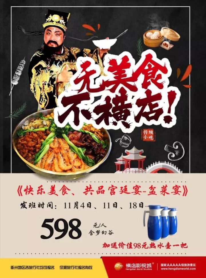 这次去横店,不但有宫廷宴(价值1188元/桌)吃!,还有盆菜宴,让你一次吃个够!有游乐园玩!来一次看看风景,偶遇明星,观赏表演的宽松休闲的之旅可好?!