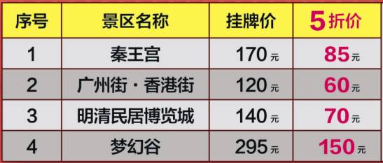 梦幻谷、广州街.香港街、明清民居博览城、秦王宫——均享挂牌价5折