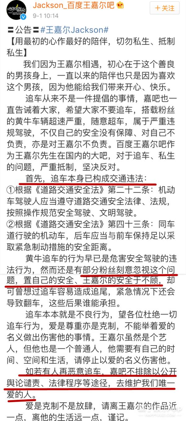 后来王嘉尔的粉丝后援会也发了声明,表示追车已经构成了交通违法。如果再有粉丝出现这种追车行为,后援会将采取法律途径保护自己的爱豆。